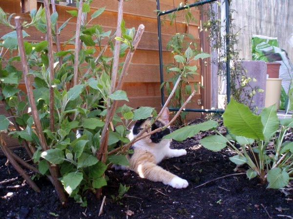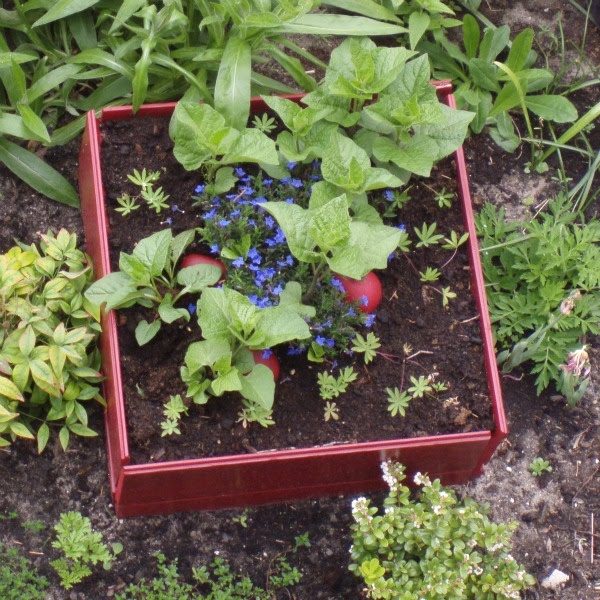 In februari had ik een project afgemaakt en hierover gepost. Ik laat nu zien wat er in de tussentijd mee gebeurt is. De bak staat nu in de achtertuin met aarde en kleikorrels. Die laatste zie je niet want de aarde ligt er overheen. In de bak staat parelzaad, dat is het blauwe spul, Chinese lampion en, sinds kort, lupine. Zoals je kunt zien is het project nu pas echt af. Hoewel…