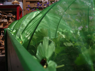 De pastinaak komt op. Het zijn nu nog lieve kleine stekjes maar ze doen erg hun best uit te groeien tot grote stoere wortels. Tenzij ze, net als de broccoli vorig jaar, aangevallen worden door rupsies. Om dat te voorkomen zou ik een soort van tentendak maken van een plastic gaas wat ik gekocht heb voor dit doel. Maar nog voordat ik aan het bouwsel zou beginnen begaf mijn nietschietapparaat het en had ik er meteen geen zin meer in. Vandaag is plotseling, na een kort bezoek aan een goedkope kleding en rotzooiwinkel, het probleem op gelost. Op een kleurrijke manier mag ik wel zeggen.
