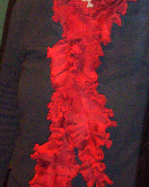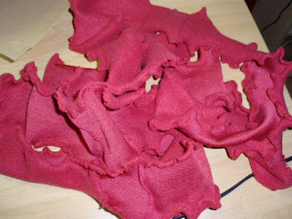 Stap 1. Men neme een oude/ongewenste sweater. Let erop dat de stof enigszins rekbaar is en niet rafelt. Knip er stroken uit. Deze moeten minstens tien centimeter breed zijn. Die van mij waren twaalf en zo kon ik drie stroken knippen nadat ik de rits al had verwijderd. De stroken naai je aan elkaar zodat je een hele lange strook stof heb. Mijn strook was meer dan 3 meter.Whoehoe!